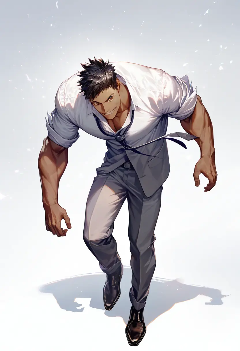 v2 でキャラシート形式にしたが、まだマッチョすぎるし肌が黒すぎる。「居酒屋で後輩の相談に乗る面倒見のいい先輩」のイメージからは程遠い。