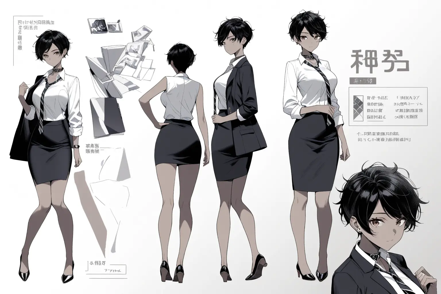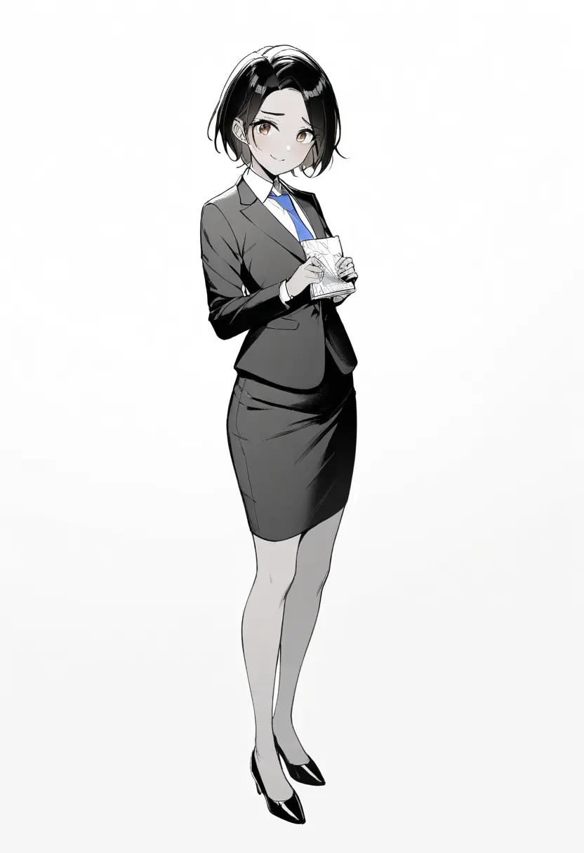 原作ではワタシは男性だが、マンガ版では見栄えのよさから女性に変更した。「ダークネイビーのスーツ、ショートヘア、真面目で一生懸命」という設定でプロンプトを組んだ。