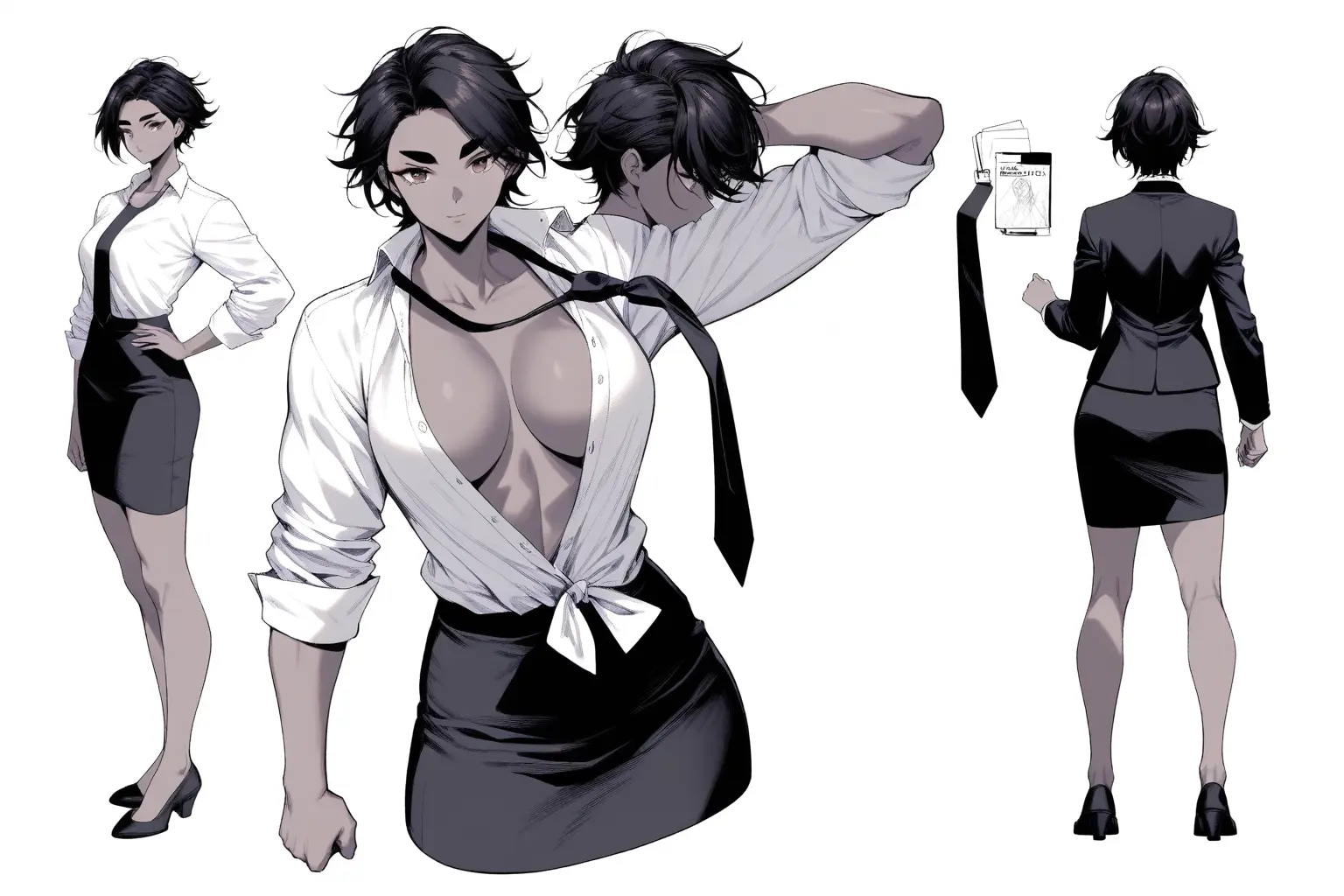 v2 で方向性が合ってきたと思ったら、v3 でまたシャツがはだけてセクシー路線に戻る。プロンプトを追い込んでも、モデルが「かっこいい女性」を「セクシーな女性」と解釈する癖が抜けない。