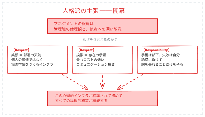 「論理や構造がいかに優れていても、それは笑顔や挨拶、部下に胸を張って説明できないことはやらないという人格的インフラの上でしか機能しません。システムを動かすのは人間であり、管理職の姿勢が組織を支える最も深い土台です」