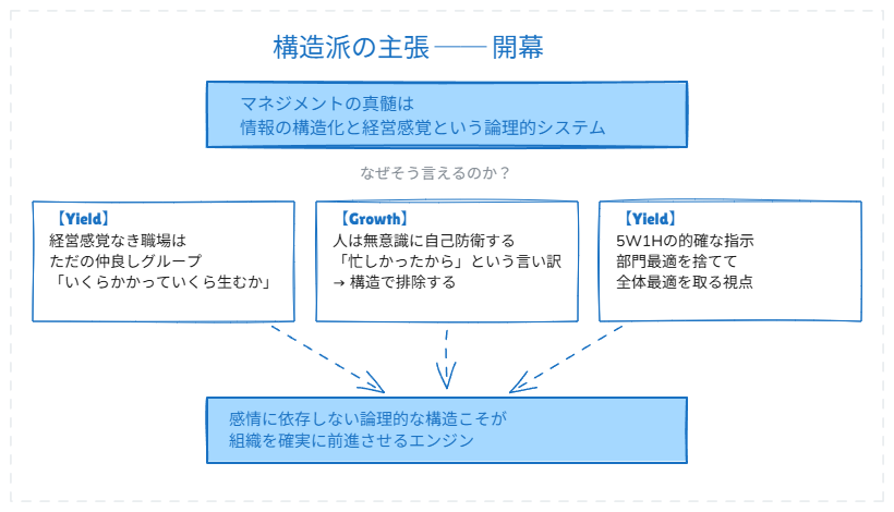 「やってみないと次がない。この議論に絶対的な勝者はいません。構造と感情のバランスという問いと向き合うこと——その葛藤こそがマネジメントの真の第一歩なのだと思います」