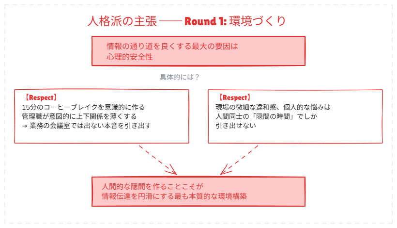「情報の通り道を良くする最大の要因は心理的安全性です。15分のコーヒーブレイクを意識的に作り、管理職が意図的に上下関係を薄くする。業務の会議室では絶対に出てこない部下の本音や現場の微細な違和感は、人間同士の隙間の時間でしか引き出せません」