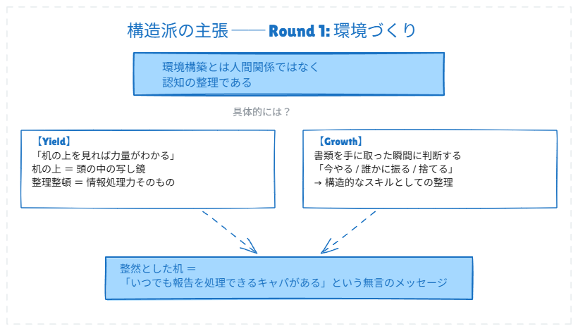 「環境構築とは人間関係の構築ではなく、認知の整理です。『机の上を見れば力量がわかる』——机の上は頭の中の写し鏡であり、整理整頓は情報処理力そのもの。整然とした机は『いつでも報告を処理できるキャパがある』という無言のメッセージになるのです」