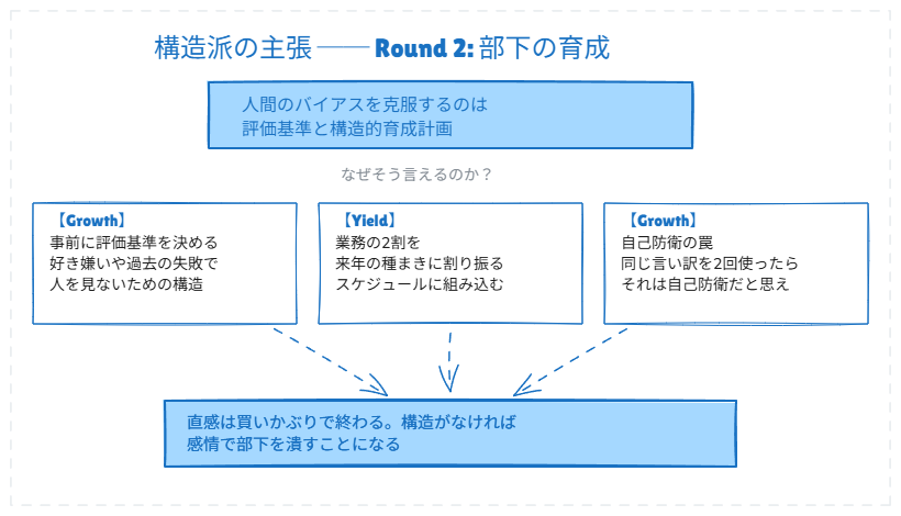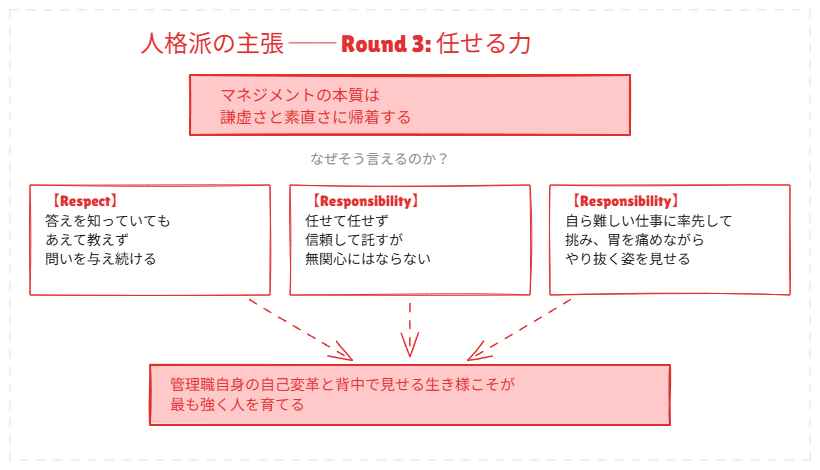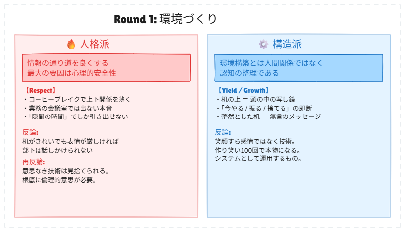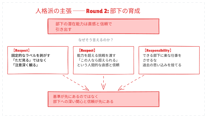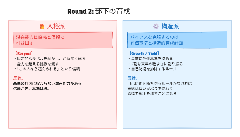 片方は「マネジメントの根幹は管理職の人格だ」と主張し、もう片方は「いや、論理的な仕組みこそが本質だ」と真っ向から反論する。どちらも YRGR の物語から根拠を引っ張ってきて、筋の通った議論を展開している。