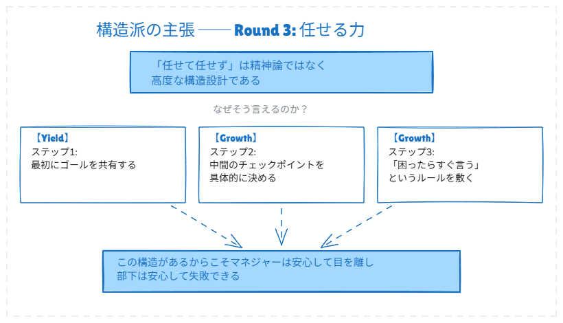 「『任せて任せず』は精神論ではなく、極めて高度な構造設計です。ゴールを共有する。中間チェックポイントを決める。『困ったらすぐ言う』ルールを敷く。この3ステップがあるからこそ、マネージャーは安心して目を離し、部下は安心して失敗できるのです」